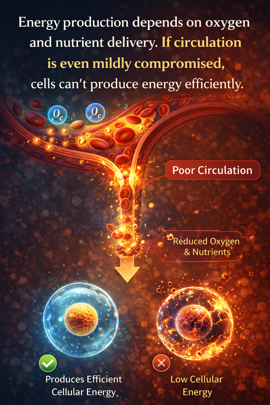 Energy production depends on oxygen and nutrient delivery. If circulation is even mildly compromised, cells can’t produce energy efficiently.